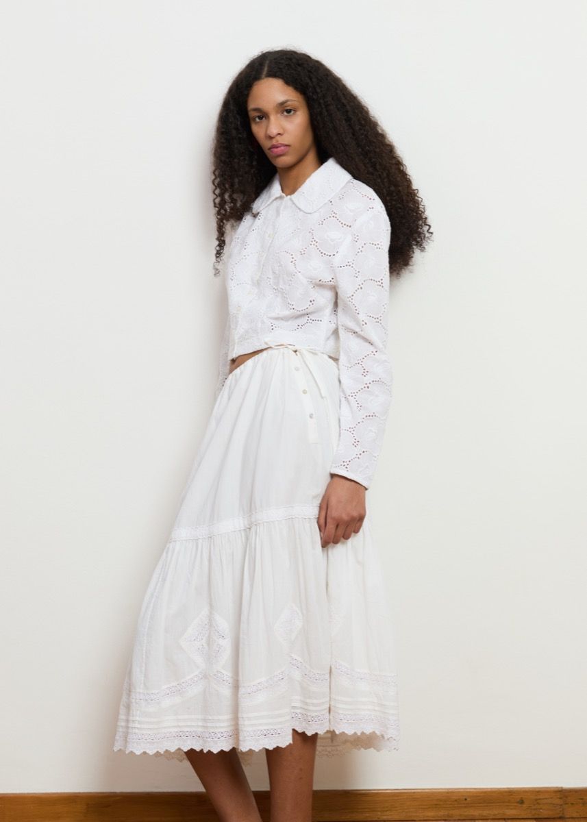 The Lori Shirt is a feminine fitted style that we love layering open or buttoned up alone. It sits slightly cropped and features a center front opening with natural mother of pearl buttons and a soft floral Akoba cotton fabric. Ship out for this item starts April 30th*