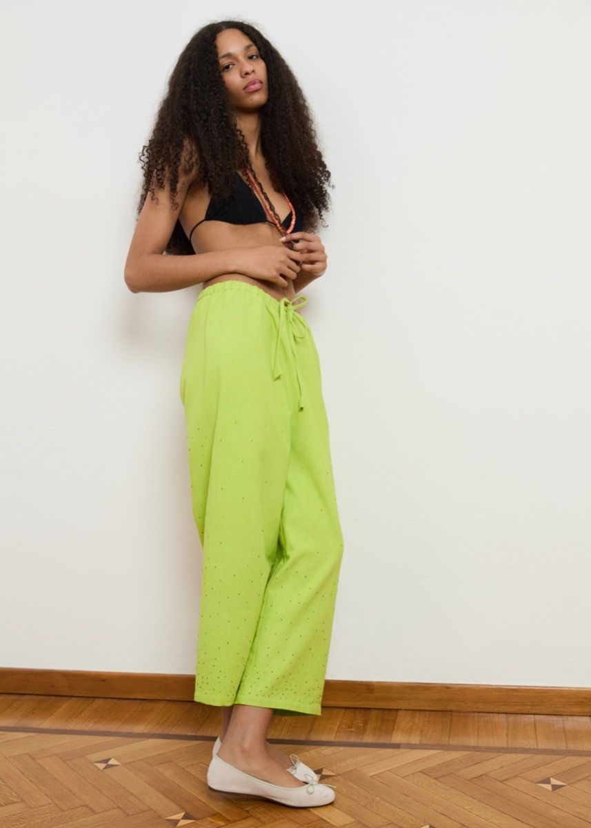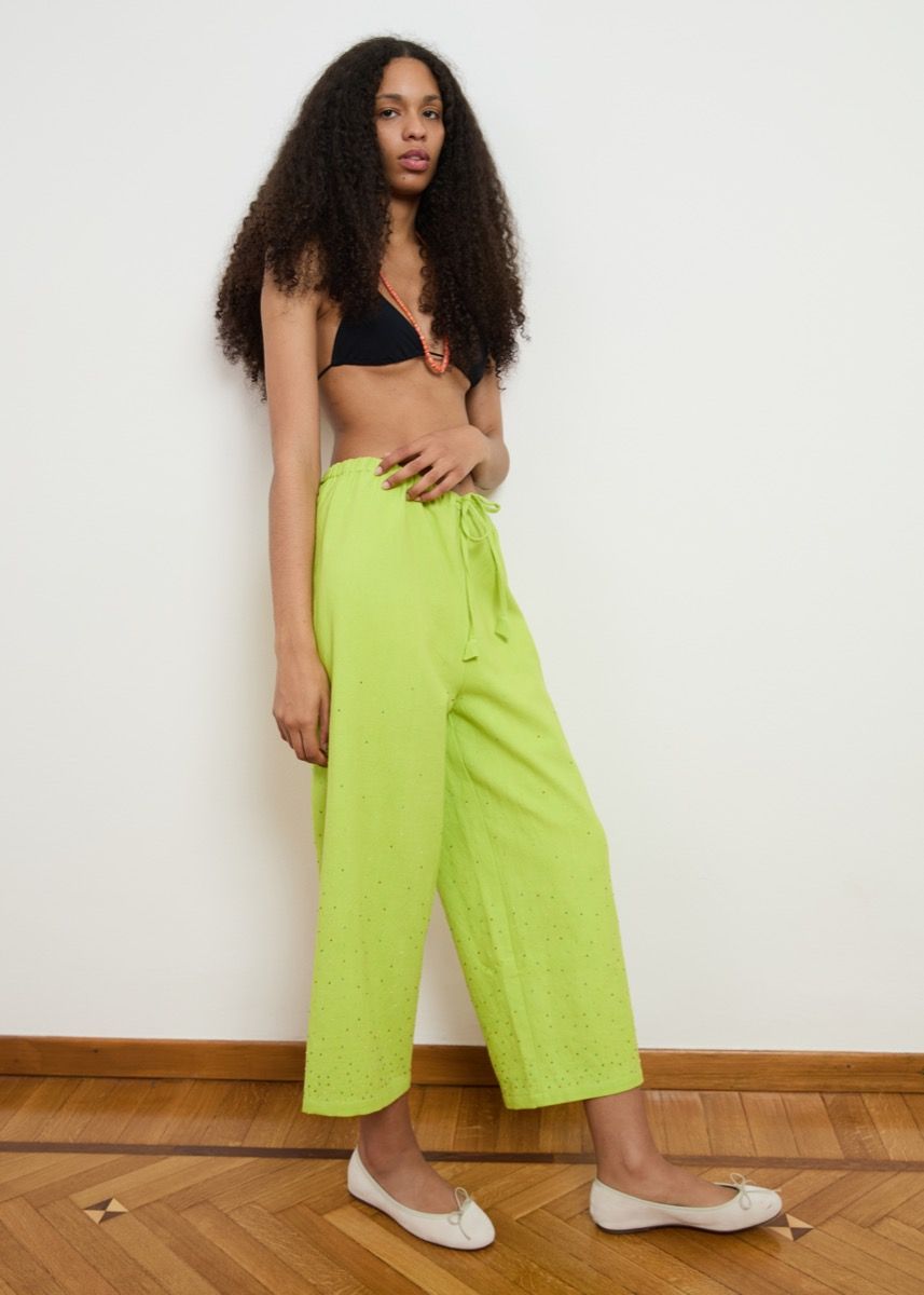 A new addition to the family, the Bongo Chill pants have an easy fit and will be our go to for everyday wear for their ultra comfort and versatility. The Citrus rainbow has an entirely hand embroidered design on organic cotton. With individually placed colourful glass beads that start clustered at the hem and slowly disperse upwards. Ship out for this item starts April 30th*