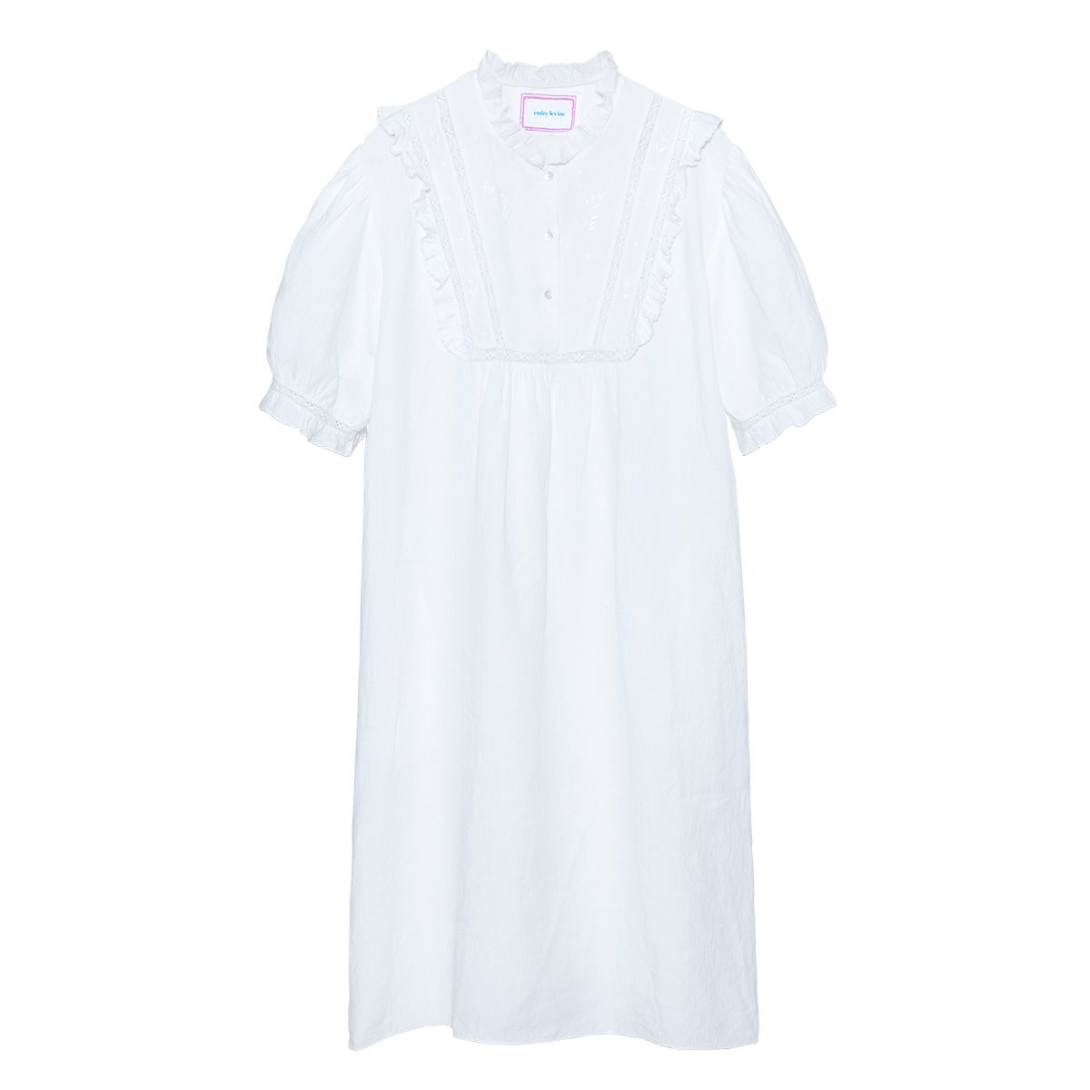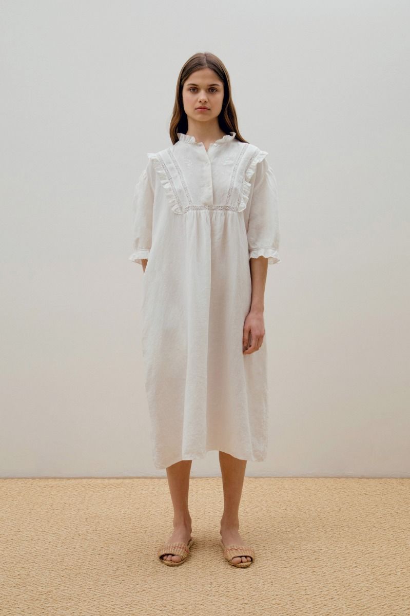 Introduced in a crisp breathable 100% linen, the Isla dress features natural mother of pearl buttons at center front, cotton lace detailing and gathered ruffle with scalloped edges at neckline yolk and sleeve cuff. With a floral polka all over embroidery on chest and back yolk giving this easy fit silhouette a delicate touch. It's a style you can throw on in the city, holiday or travel as linens wrinkles are a part of this natural fibres charm.