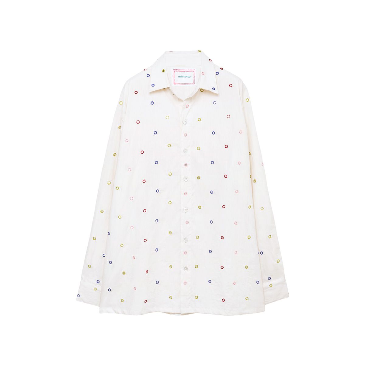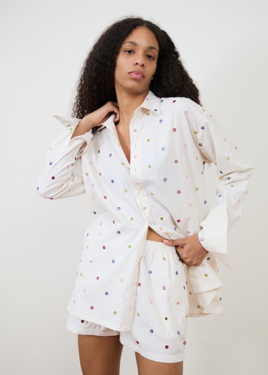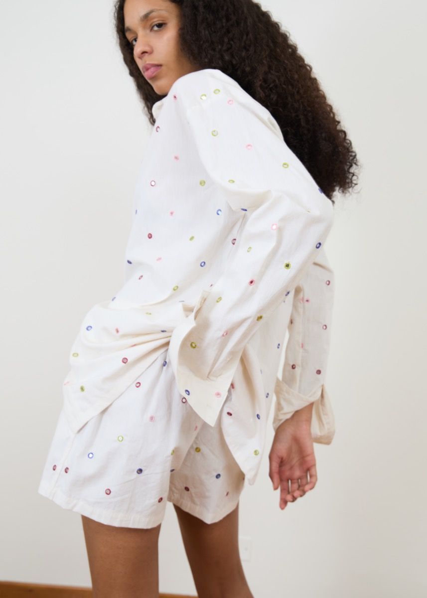 One of our most special pieces of the season, the mini rainbow mirror work on each garment is all hand embroidered one by one. Originally used on traditional garments in Gujarat, one of my favourite areas in India. Each mirror is made from real glass and is embroidered over the edge three times to secure them into place onto cream organic cotton fabric. They are a limited edition piece.