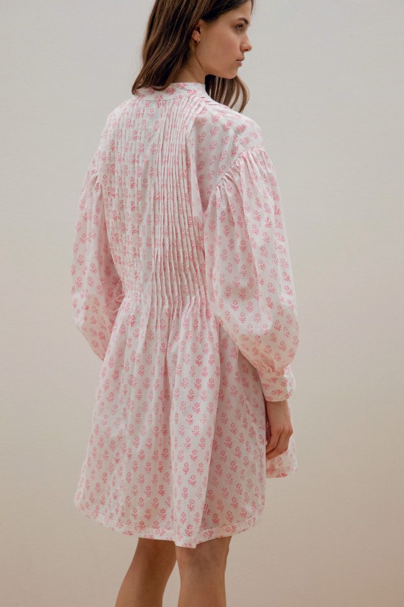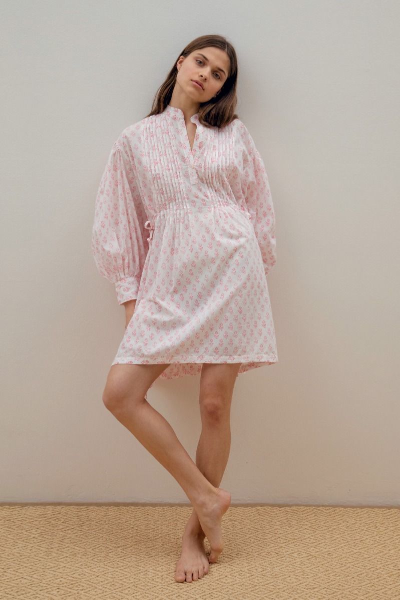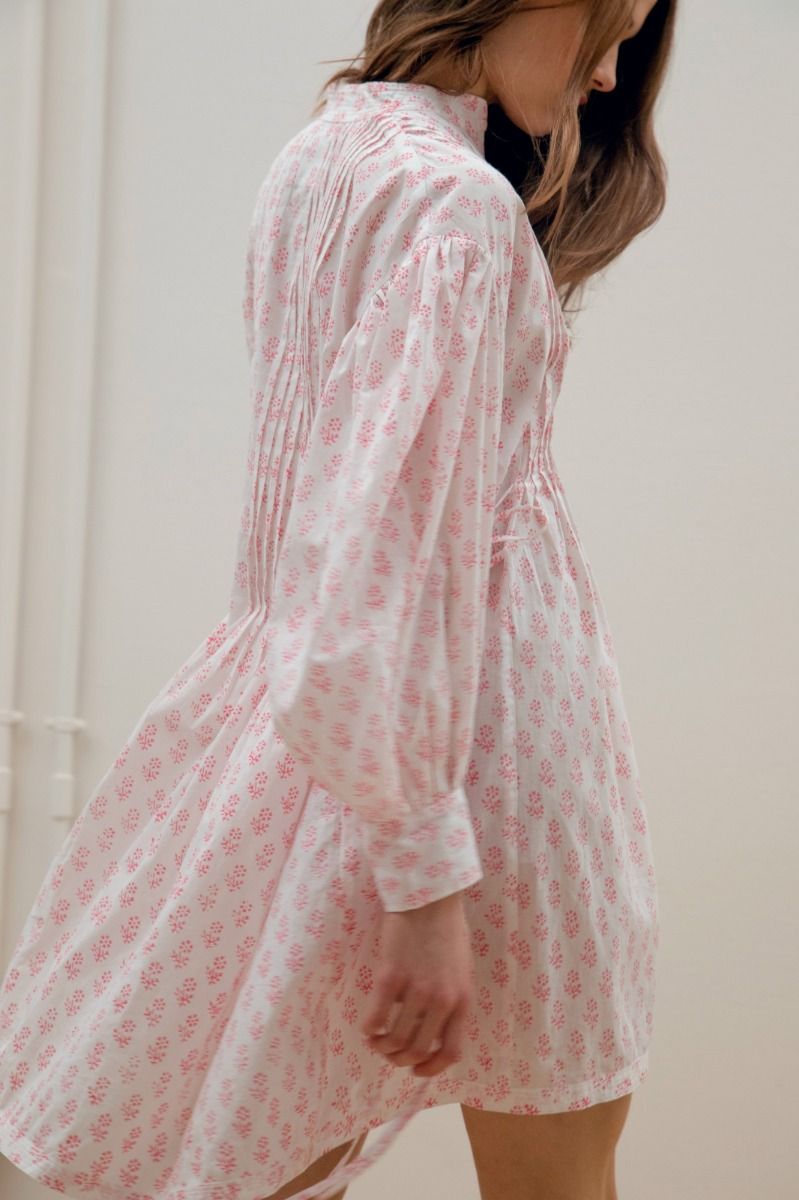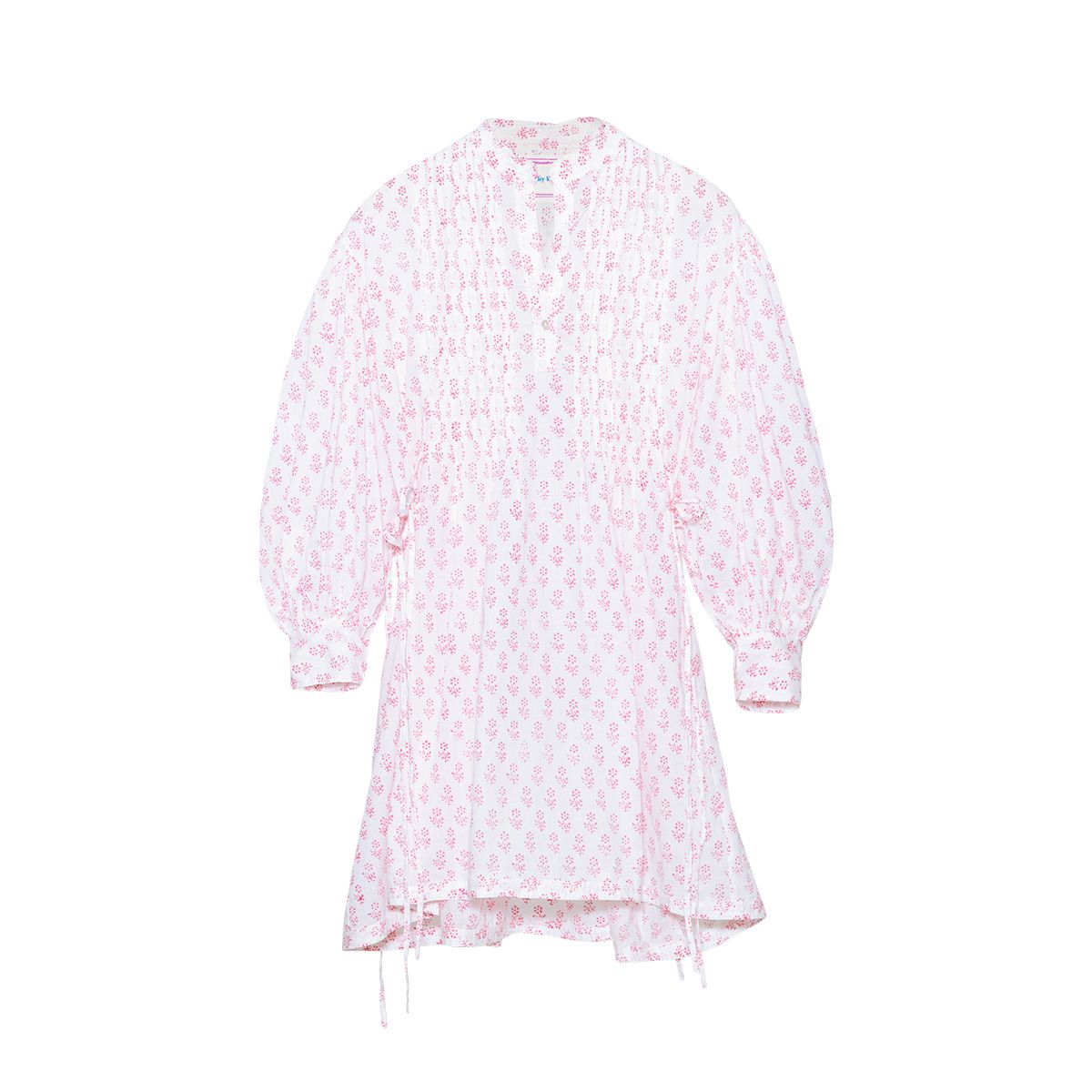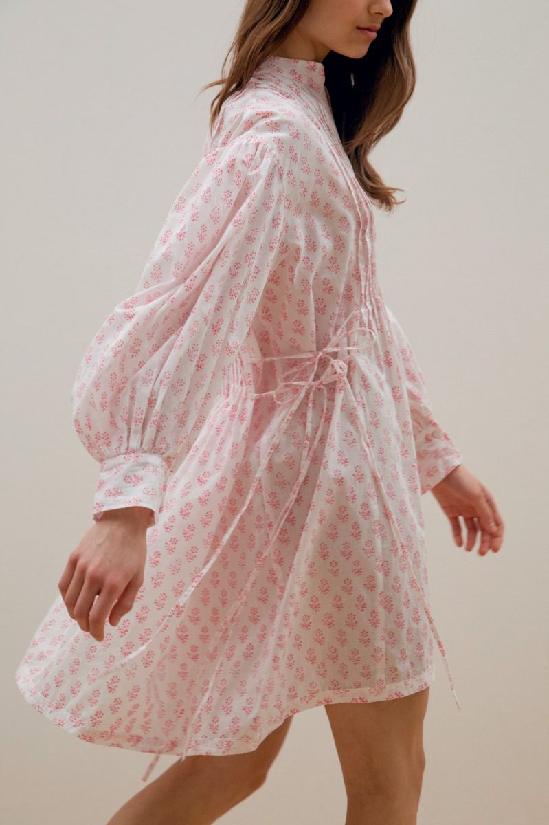 The Ila Blouse dress is made of organic cotton and hand block printed. Featuring strings on either side to find a more customisable and comfortable fit, mother of pearl buttons, voluminous gathered sleeves, and pin-tuck pleating.