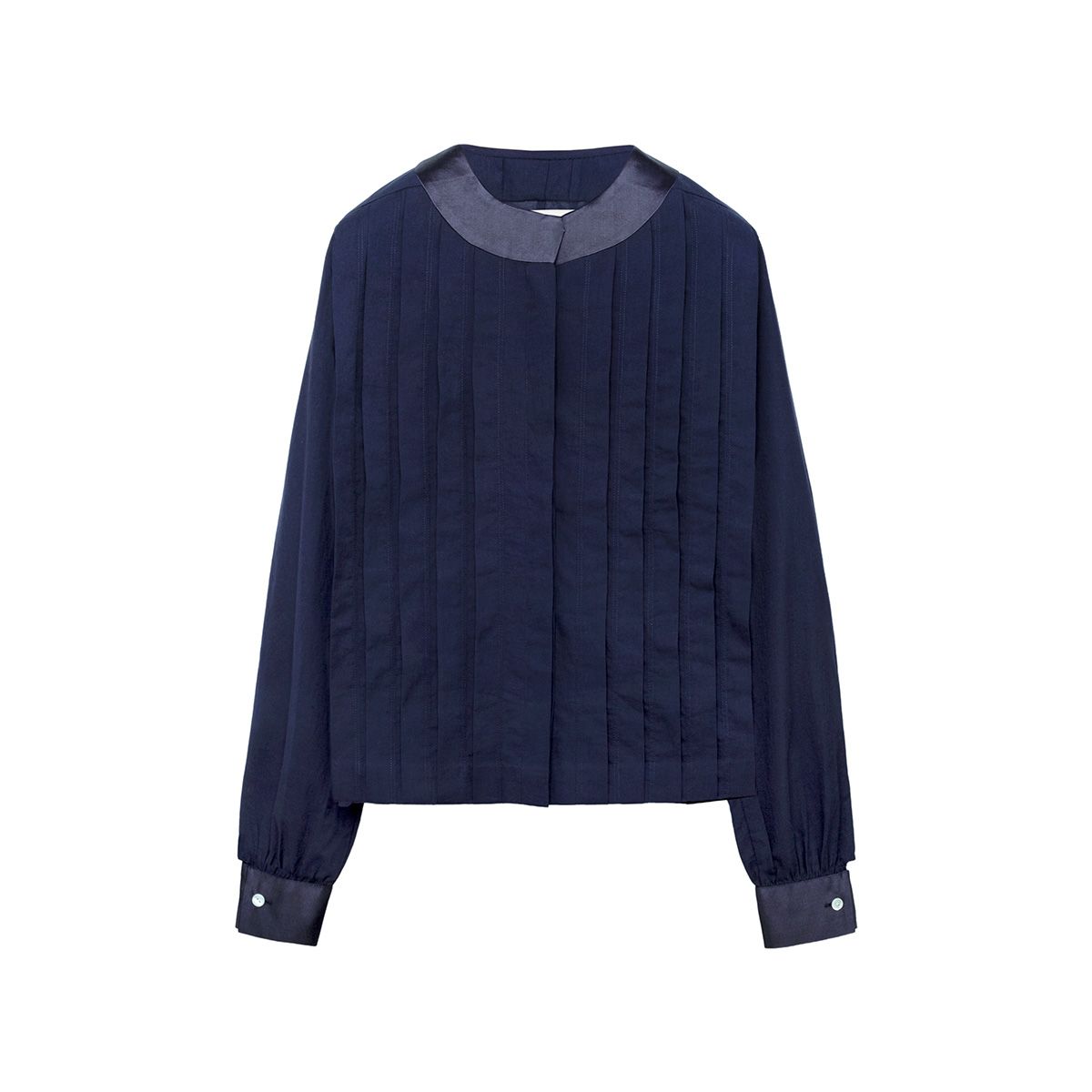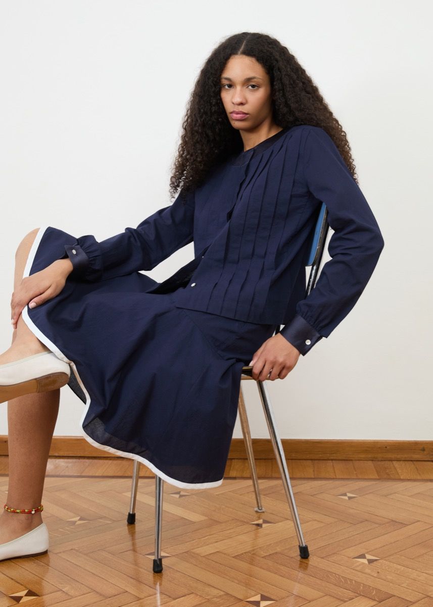 The Mandarin Shirt features delicate pleating and removable button cufflinks out of natural mother of pearl. Made of organic cotton and mulberry silk at collar and cuff. The mulberry silk was sourced from remnants of past production. Styled above as a set with our Circle skirt in navy. Ship out for this item starts April 30th*